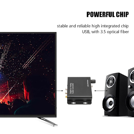 - Digital to Analog Conversion: Converts optical and coaxial digital audio signals into analog RCA and 3.5mm AUX output.