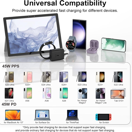 - Universal Compatibility: Designed for a wide range of Samsung Galaxy devices including S24, S24 Ultra, S24+, S23, S23+, S23 Ultra, S22, S22+, S22 Ultra, S21, S21 FE, S21 Ultra, S20, S20 FE, S20 Ultra, S10, S9, S8, Note 20, Note 20 Ultra, Note 10, A Series (A13, A15, A55, A54, A53, A52, A51, A50, A34, A33, A72, A71, A70, A05S, A04S, A03S), Tab S9/S8/S7, Z Flip4, Z Flip3, Z Fold3, Z Fold2, and any other USB-C enabled devices, providing versatile charging for multiple devices.